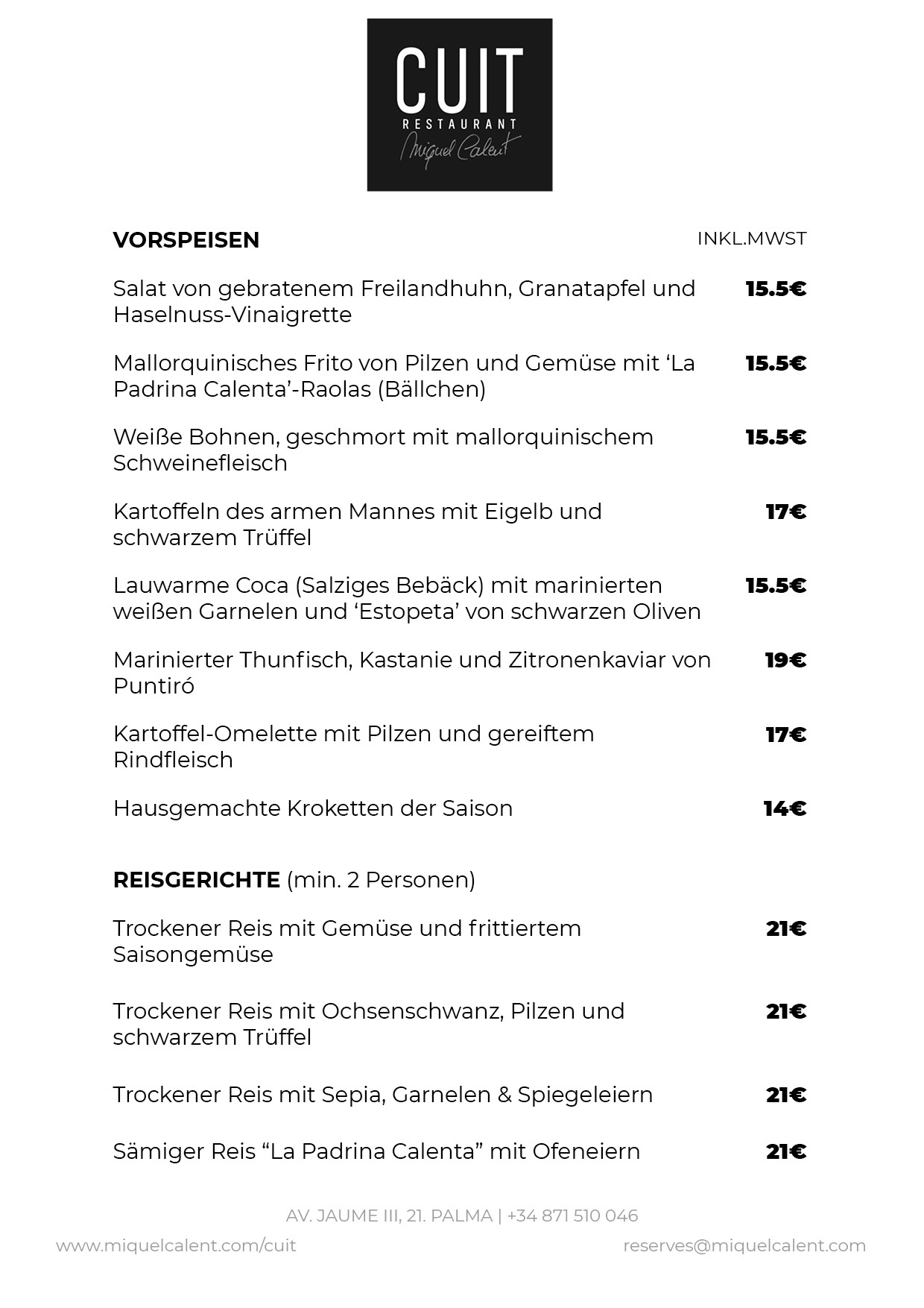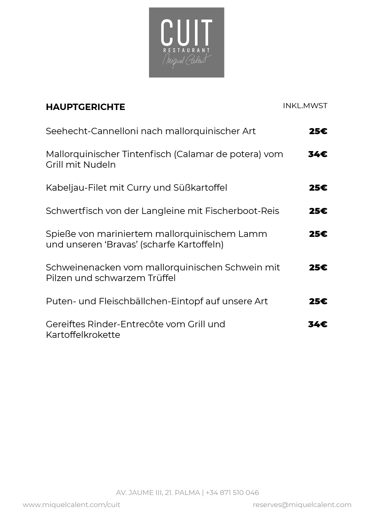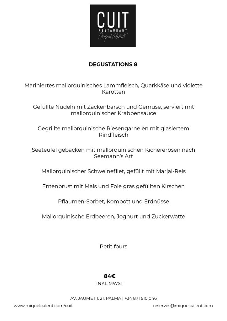 In der achten Etage des Nakar Hotels befindet sich das Restaurant Cuit. Mit einem atemberaubenden Blick auf die Bucht von Palma, die Kathedrale und die Altstadt ist Cuit das erste Projekt von Miquel Calent in Palma. Traditionelle und saisonale Küche, inspiriert von der gastronomischen Tradition der Insel und – natürlich – mediterranem Einfluss und zu gleichen Teilen verfeinert mit aktuellen kulinarischen Trends und wieder gewonnenen traditionellen Rezepten.